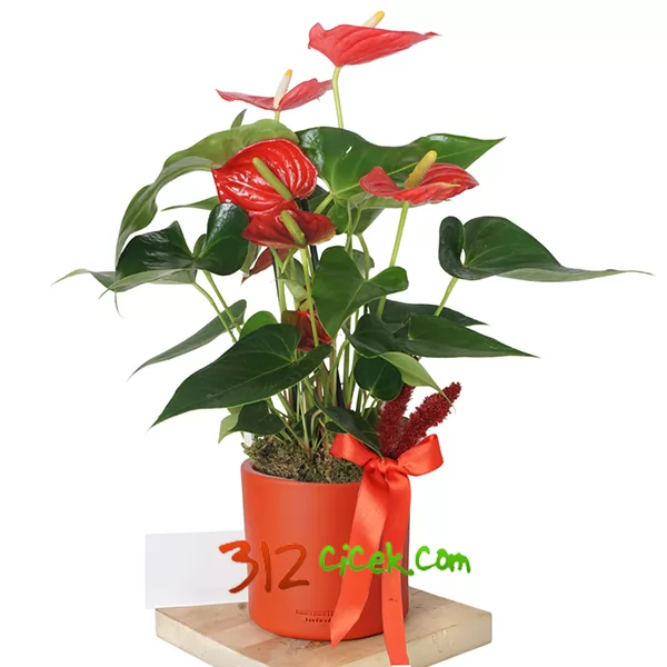 Görseldeki Kırmızı Antoryum Orjinal Saksısındadır ve Alt Tarafı Elyaf ve Tergel İle Süslenerek Teslim Edilmektedir.